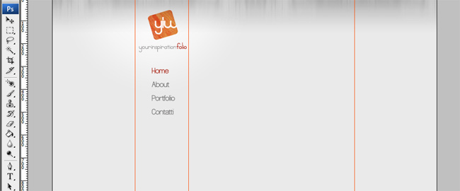 Come puoi vedere, ho già delimitato con una guida quella che sarà la sezione di sinistra del nostro layout: In questa sezione, larga 250px, inseriremo logo, menù di navigazione, informazioni sul copyright. Nella sezione di destra disegneremo invece le pagine del sito.