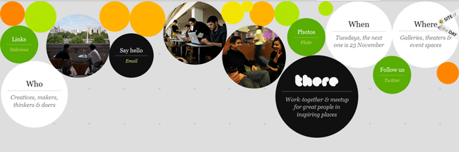 Il sito dell’agenzia There é senz’altro estremamente originale: con un particolare effetto javascript, infatti, le numerose sfere che contengono alcuni link (come quello alle immagini su flickr) e alcune informazioni possono essere spostate sullo schermo con un curioso effetto rimbalzo; inoltre, cliccando con il mouse sullo sfondo, compariranno numerosissime sfere colorate di diverse dimensioni.