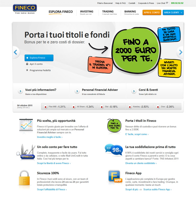 Il sito della banca Fineco è estremamente usabile e pulito. Il look è moderno e alcuni dettagli di colore, oltre alle particolari immagini dello slider, rendono il layout molto gradevole. Le icone danno un taglio fresco e giovanile alla pagina e il footer è uno spazio utile, che riassume la struttura del sito e i link utili all’utente.