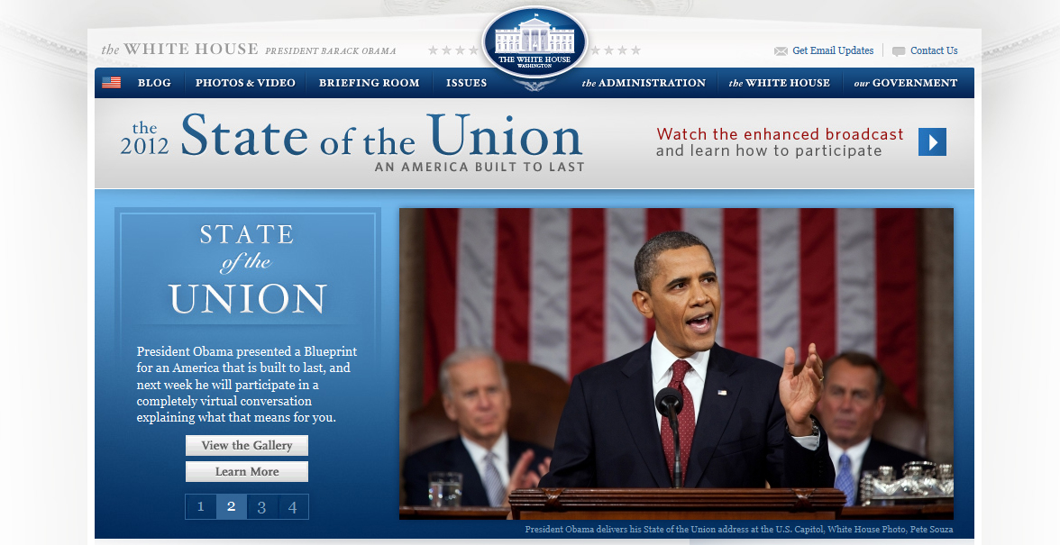 Proprio perché ispira fiducia e infonde una sensazione rassicurante, il blu è un colore ampiamente utilizzato nei siti a carattere politico. Nell’esempio sotto vediamo il bellissimo blu nel sito della Casa Bianca.