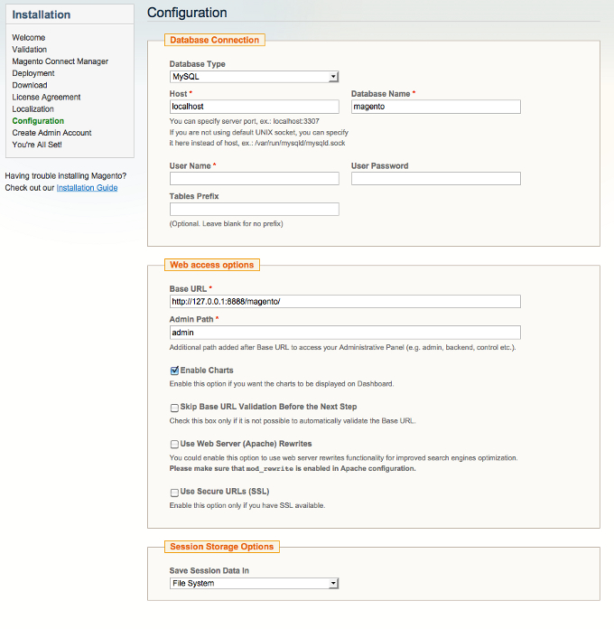 La versione indicata nella pagina di download dei dati di esempio è sempre l’ultima disponibile e anche se non coincide con l’ultima release di Magento, possono essere utilizzati tranquillamente. La cartella dei dati di esempio è formata da due parti: il database .sql e la cartella media. Il file sql andrà caricato nel database che dovrai utilizzare mentre la cartella media dovrà sovrascrivere quella esistente nella root di Magento. Una volta conclusa anche questa parte si passa all’installazione vera e propria del CMS.