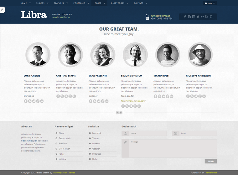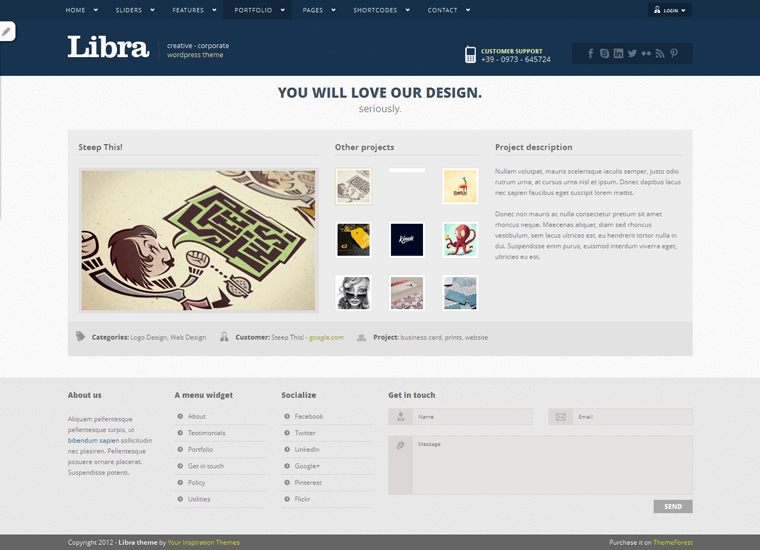 Libra è un potente tema corporate/portfolio con un layout molto ampio (1170 pixel), ma straordinariamente responsive. Infatti, se provi ad aprirlo nel tuo tablet o nel tuo smartphone ti accorgi che non ci sono limiti di uso o di fruizione dei contenuti. Il tema si adatta perfettamente sia ai monitor da scrivania sia al più piccolo display di un iPhone.