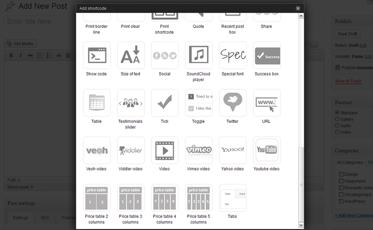 La pagina dei servizi può essere configurata e implementata grazie a uno shortcode manager presente sulla barra degli strumenti dell’editor della pagina. Senza scrivere una sola riga di codice, puoi configurare pulsanti, icone o mostrare i servizi nella modalità che preferisci. Molto semplice e intuitivo.