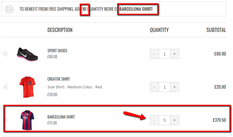 Es. Continuando con l’esempio di prima, se in Required quantity mettiamo 15 e nel carrello ci sono 5 prodotti di quel tipo, il messaggio mostrerà che mancano ancora 10 articoli per la spedizione gratuita.